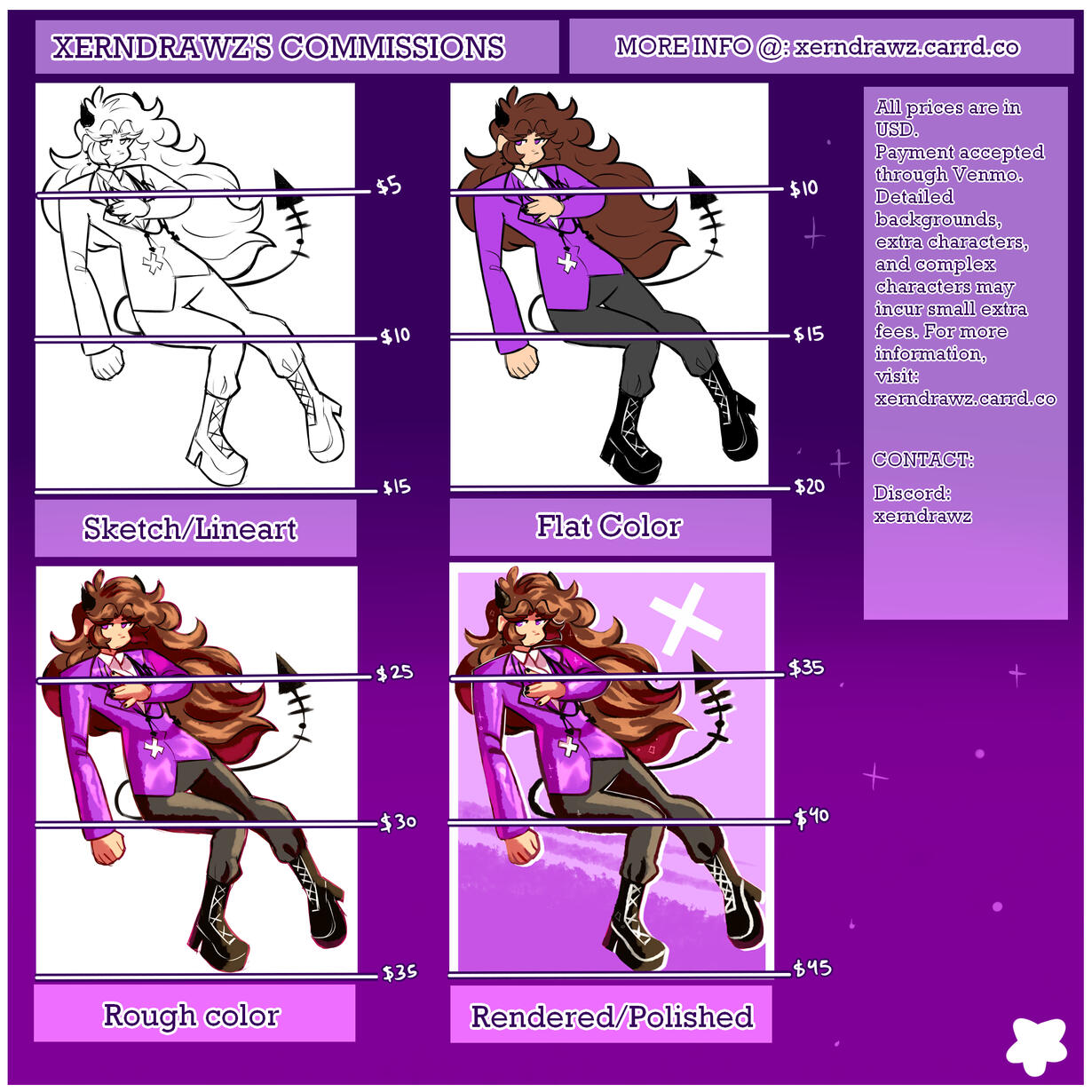 ☆ This page serves as general guidelines for commissioning XernDrawz which includes payment information, customer rights, time of delivery, usage and more. By requesting a commission, you agree to the listed terms and conditions.